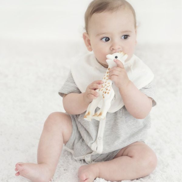 Sophie is made of 100% natural rubber and colors that are also used in cooking and it is perfectly safe for the baby to chew it, as it would with a pacifier or the nipple of a bottle. Its soft texture and its many chewable parts (ears, horns, legs) give the baby enormous relief to his aching gums during teething.